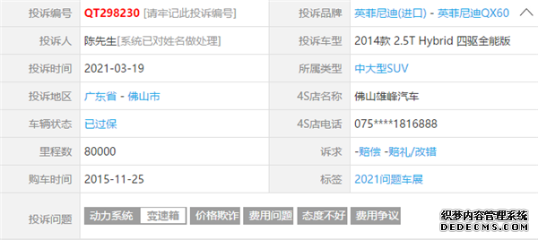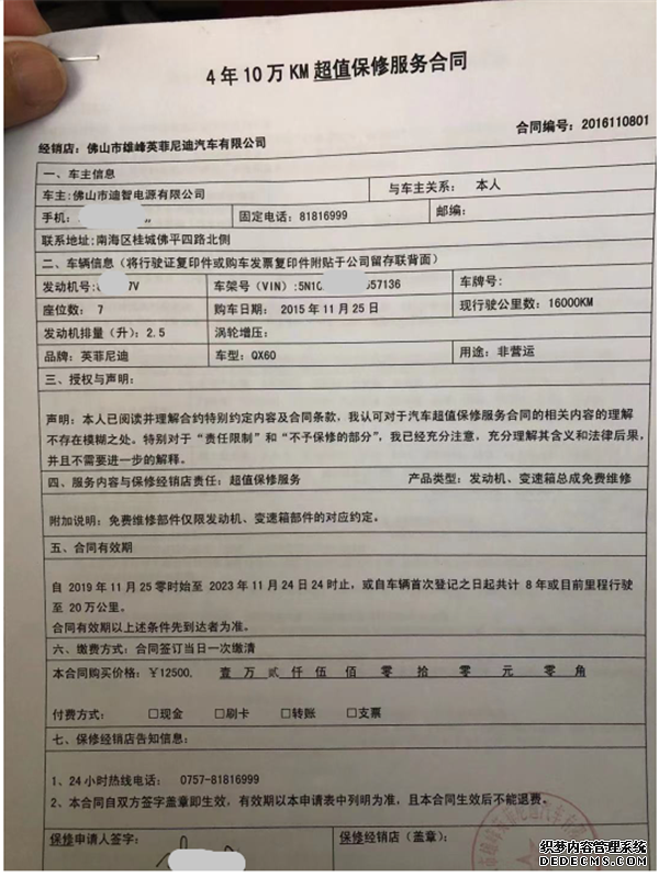 為了維護(hù)車主的合法利益,同時(shí)也是為了對相關(guān)涉事企業(yè)進(jìn)行監(jiān)督,小編撥通了這位陳先生的電話。在電話中,陳先生向小編描述,他在2015年的年底購買了一輛英菲尼迪QX60車型。由于在購買后不久便在車友的口中得知英菲尼迪QX60普遍存在的變速箱問題,所以在之后當(dāng)事人便到4S店專門花一萬二購買了一份延長保修的項(xiàng)目,同時(shí)也是給自己買一份安心。