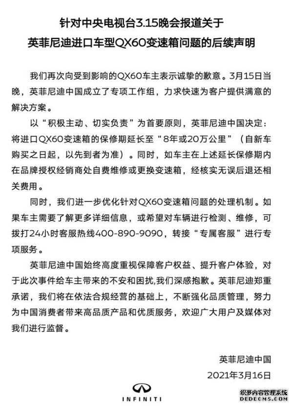 然而,事發(fā)之后,英菲尼迪官方以最快的速度發(fā)表了一份后續(xù)聲明。在這份聲明中,我們可以看到,英菲尼迪除了就這次事件進(jìn)行道歉以外,還對購買英菲尼迪的車主作出了兩點(diǎn)承諾:第一,幫助QX60的車主將保修由原來的4年十萬公里延長至8年20萬公里;第二,退還車主在保修期內(nèi)維修的相關(guān)費(fèi)用。