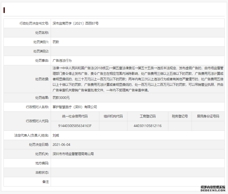 危機公關(guān):中國網(wǎng)財經(jīng)6月7日訊 日前,深圳市市場監(jiān)管局發(fā)布的“行政處罰公示”顯示,掌護智慧醫(yī)療(深圳)有限公司因廣告違法行為,被罰3000元。