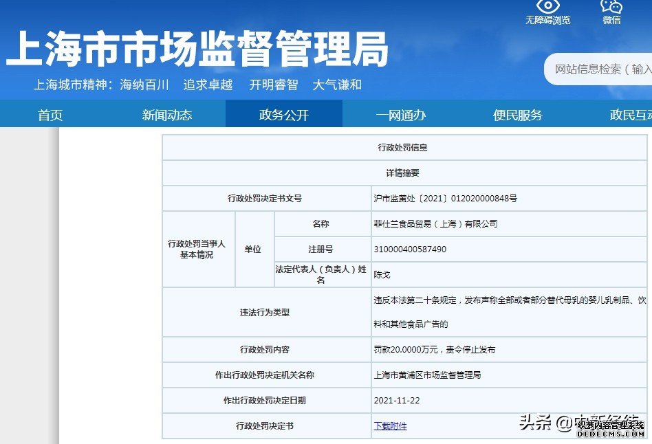 滬市監(jiān)黃處〔2021〕012020000848號(hào)罰單顯示,當(dāng)事人為菲仕蘭食品貿(mào)易(上海)有限公司。具體來(lái)看,2020年7月16日,上海市黃浦區(qū)市場(chǎng)監(jiān)督管理局接舉報(bào),稱天貓網(wǎng)絡(luò)平臺(tái)商店“皇家美素佳兒官方旗艦店”中,在一款名為“【皇家美素力】荷蘭原裝進(jìn)口奶粉1段800g*1(適用0-6個(gè)月)”的產(chǎn)品宣傳頁(yè)面中有“天然含有乳磷脂、天然含有OPO類似結(jié)構(gòu)脂、天然乳鐵蛋白……科技解密母乳珍稀營(yíng)養(yǎng)”“親近源乳比例、促進(jìn)DHA吸收珍稀乳磷脂營(yíng)養(yǎng)組成比例接近源乳”等內(nèi)容。