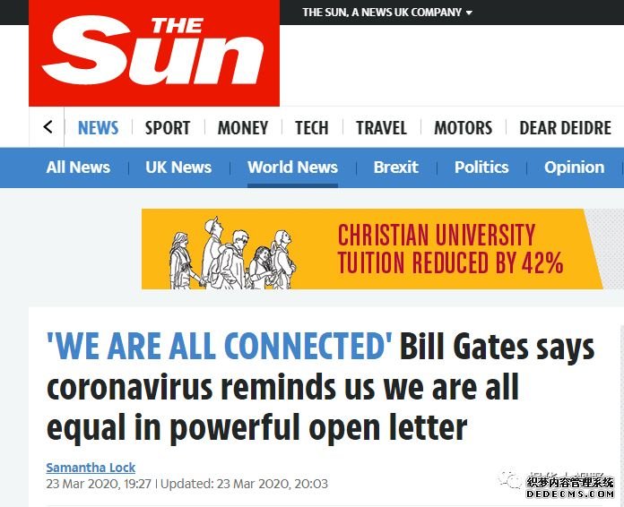 今天英國(guó)《太陽(yáng)報(bào)》 刊登了比爾蓋茨的公開信,這封信得到極大關(guān)注,得到很多人轉(zhuǎn)發(fā),人們稱贊比爾蓋茨是真正的智者,并有人第一時(shí)間就把他的公開信翻譯成中文。下面是比爾蓋茨的信內(nèi)容。********************** 我堅(jiān)信發(fā)生的每一件事后面都有一個(gè)精神層面的目的,無(wú)論我們認(rèn)為是好還是壞。 當(dāng)我沉思時(shí),我想與大家分享我的心得,新冠病毒究竟對(duì)我們做了些什么。 1) 病毒提醒我們,人都是平等的,無(wú)論我們的文化、宗教、職業(yè)、經(jīng)濟(jì)狀況,或是一個(gè)人有多么出名。在病毒眼中我們都是平等的,也許我們也應(yīng)該平等對(duì)待他人。如果你不相信我的話,那就去問(wèn)湯姆·漢克斯。 2) 病毒提醒我們,我們的命運(yùn)都是聯(lián)在一起的,影響一個(gè)人的事情同時(shí)也會(huì)影響另一個(gè)人。病毒也提醒我們,我們建立的虛假國(guó)境線毫無(wú)價(jià)值,因?yàn)椴《静⒉恍枰o(hù)照。病毒還提醒我們,雖然我們暫時(shí)受到壓迫,世界上還有人一生都受到壓迫。 3) 病毒提醒我們,健康多么珍貴。而我們卻忽視健康,吃垃圾食品,喝被各種化學(xué)品污染的水,如果我們不照顧自己,我們當(dāng)然就會(huì)生病。 4) 病毒提醒我們,生命苦短,什么是我們應(yīng)該做的最重要的事情,特別是那些已經(jīng)生病的老年人。人生在世的目的不是買一卷卷的廁紙。 5) 病毒提醒我們,我們的社會(huì)已經(jīng)變得物質(zhì)至上,當(dāng)我們遇到困難時(shí),我們才想起我們的基本需求是食物、飲水和藥品,而不是并沒有什么價(jià)值的奢侈品。 6) 病毒提醒我們,家庭是何等重要,但我們卻忽視了這一點(diǎn)。病毒強(qiáng)迫我們回到我們的房子里,所以我們可以把房子建成家庭,并建立牢固的家庭紐帶。 7) 病毒提醒我們,我們真正的工作并不是我們打的那份工,我們固然需要打工,然而上帝創(chuàng)造我們的目的并不是讓我們打工。我們真正的工作是互相照顧、互相保護(hù)、互助互利。 8) 病毒提醒我們,我們不能妄自尊大。病毒還提醒我們,無(wú)論你覺得自己多偉大,也無(wú)論別人覺得你多么偉大,一個(gè)小小的病毒就能讓整個(gè)世界停擺。 9) 病毒提醒我們,自由掌握在我們自己手中。我們可以選擇合作互助、分享、付出、互相支持,或者我們也可以選擇自私、囤積和自顧自。只有在困難的時(shí)候才能看出一個(gè)人的真面目。 10) 病毒提醒我們,我們既可以耐心,也可以恐慌。我們既可以理解這種情況在歷史上已經(jīng)發(fā)生過(guò)多次,但最后都過(guò)去了,我們也可以恐慌,以為世界末日到了,結(jié)果傷害了我們自己。 11) 病毒提醒我們,疫情既是結(jié)束也是開始。我們現(xiàn)在可以反省和理解,從錯(cuò)誤里吸取教訓(xùn)。疫情也可以是一個(gè)輪回的開始,而且還會(huì)繼續(xù)下去,直至我們吸取教訓(xùn)為止。 12) 病毒提醒我們,我們的地球病了。病毒還提醒我們,我們必須看到森林消失的速度,也必須看到一卷卷廁紙從貨架上消失的速度。我們都病了,因?yàn)槲覀兊募彝ゲ×恕?/span> 13) 病毒提醒我們,困難總會(huì)過(guò)去,然后就容易了。生活是周期性的,現(xiàn)在只是周期里的一個(gè)階段。我們不必恐慌,疫情一定會(huì)過(guò)去。 14) 許多人認(rèn)為新冠病毒的疫情是一場(chǎng)災(zāi)難,但我覺得這是一次“偉大的糾錯(cuò)”。 下面是《太陽(yáng)報(bào)》刊登的原文: