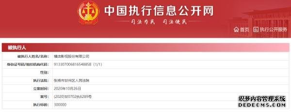 ???央廣網(wǎng)北京10月27日消息據(jù)中國執(zhí)行信息公開網(wǎng)顯示,10月26日,橫店影視股份有限公司(以下簡稱“橫店影視”)被張掖市甘州區(qū)人民法院列為被執(zhí)行人,案號為(2020)甘0702執(zhí)6289號,執(zhí)行標的為30萬元。據(jù)悉,這是橫店影視首次成為被執(zhí)行人。