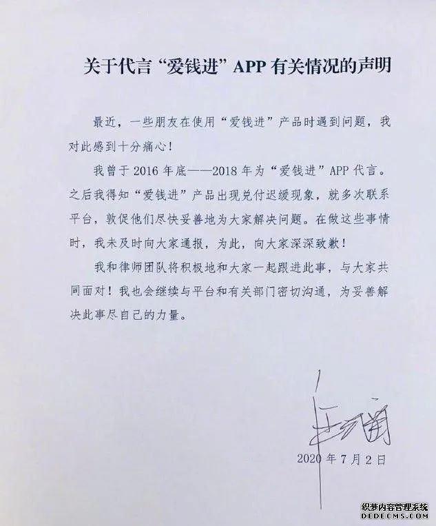 昨天,汪涵方面通過團隊發(fā)表聲明,正式承認了曾經(jīng)代言“愛錢進”的相關(guān)事實,并向廣大投資人鄭重道歉,稱自已也很痛心焦急,將會與大家一道努力幫助追債和挽回損失。